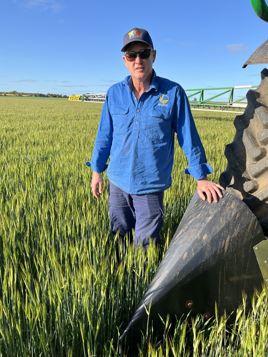 Photo caption Moora grower Erin Cahill has installed E-Kay Crop Dividers on both the front and rear wheels of his self-propelled sprayer and, as a result, he says his crop damage in cereals is now “next to nothing”.